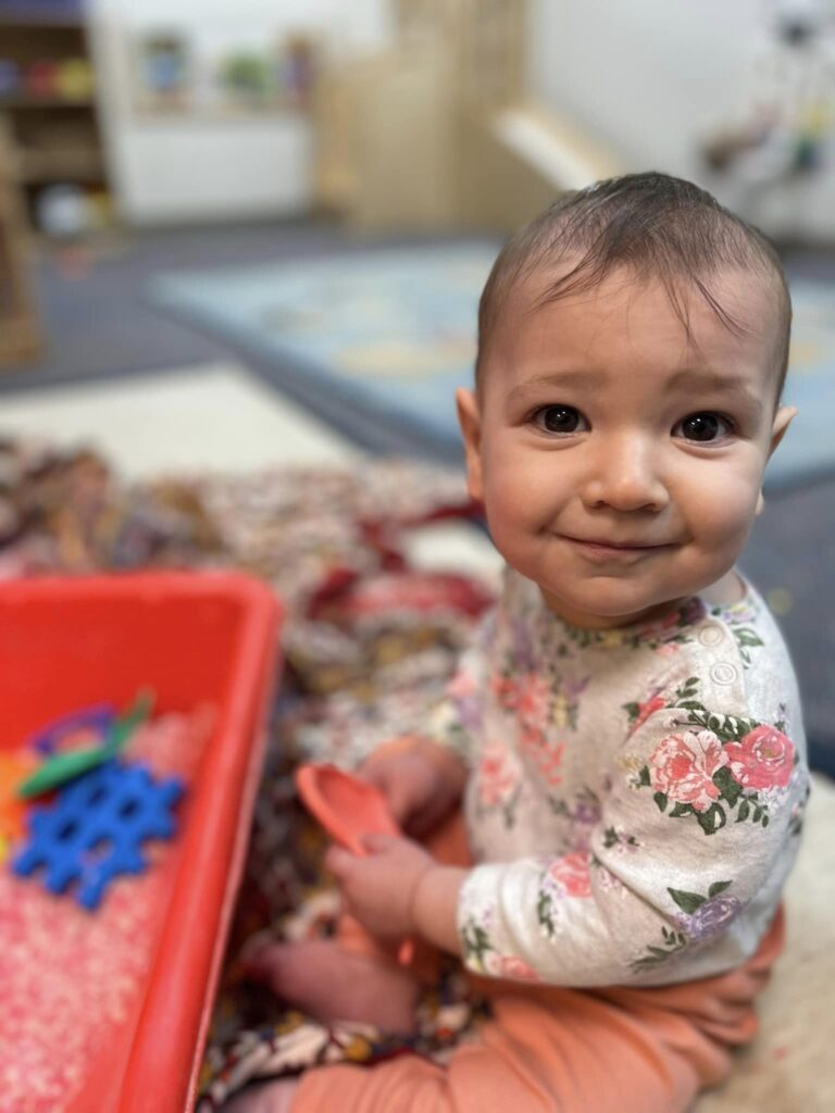 Infant activities include tummy time, supported sitting, and free movement all with access to colorful, safe toys. We also do art and music activities such as finger painting, dancing, and musical instruments. Infants go outside every day, as do children in all our programs.